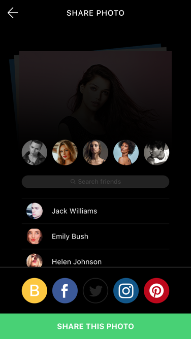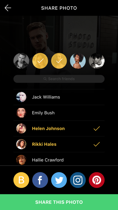 The process: After the project was kicked off I received rough sketches of the expected interface and user flows, which I then refined and communicated back with the client. I iteratively proposed a few design ideas for the application's main screen, and after the direction was clear, I continued with the visual and interaction design for the rest of the app. During the design phase I also mocked and prototyped some of the fundamental user flows of the application, such as the onboarding process and the photo sharing experience.