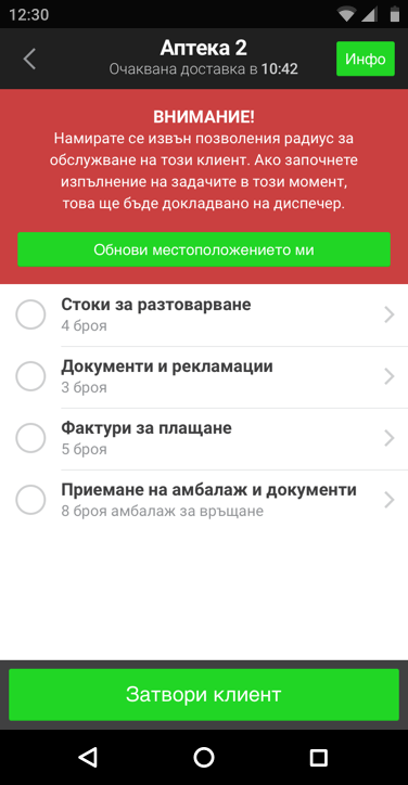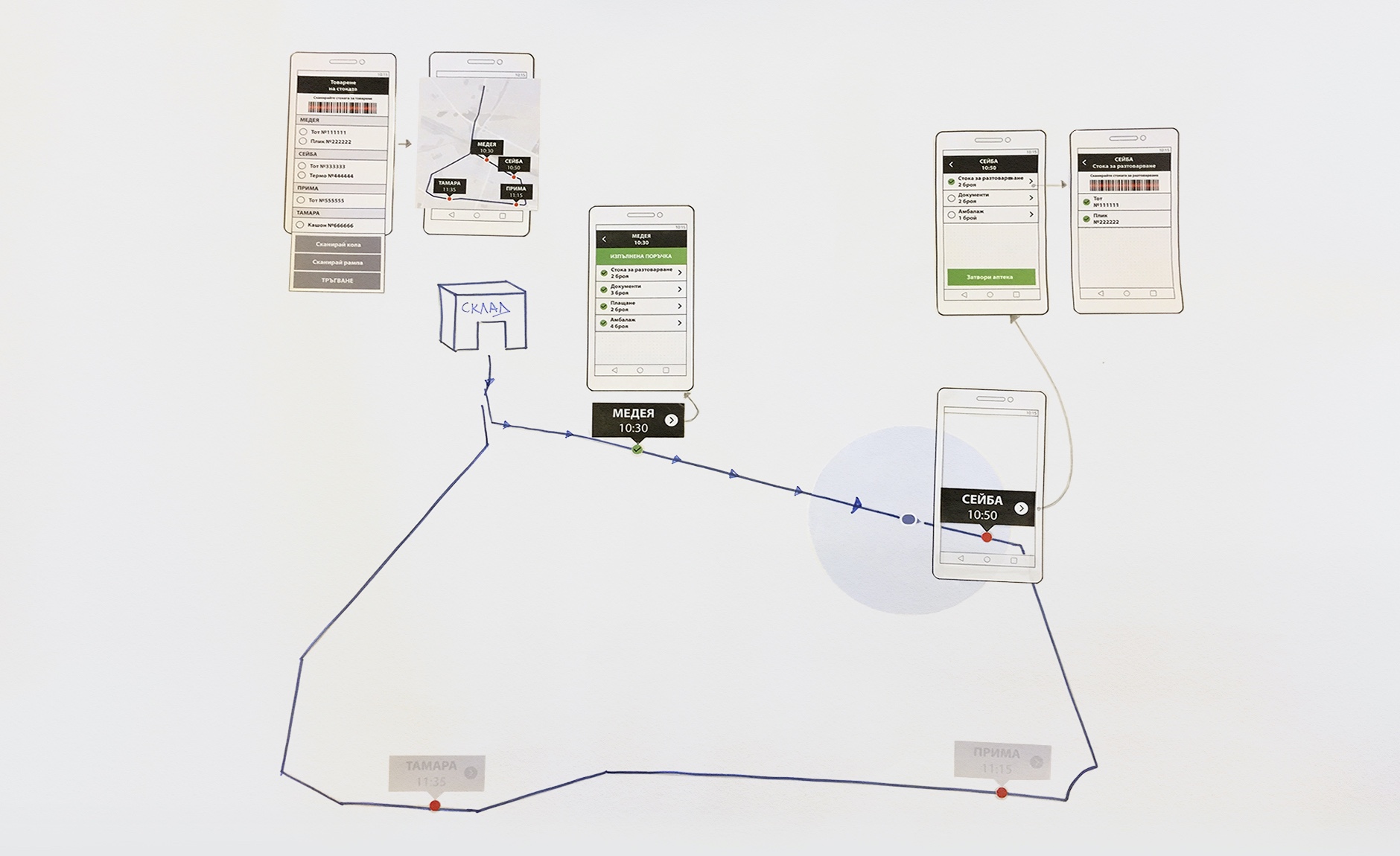 The project: In 2015 I was invited to work as a consultant on a joint project commissioned by Sopharma Trading. The goal was to entirely redesign the internal mobile application for their core business of delivering medical goods. Along with the development of the new software, we had to also rethink the entire business process guided by the following key principles: